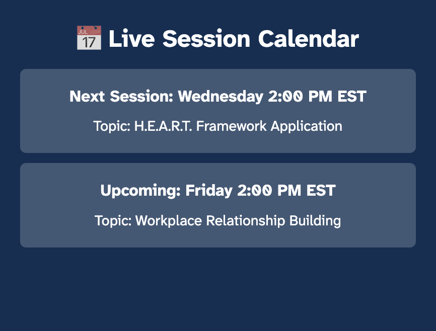See all upcoming live sessions with Dustin Rhoades, get calendar reminders, and join with one click from your student dashboard.