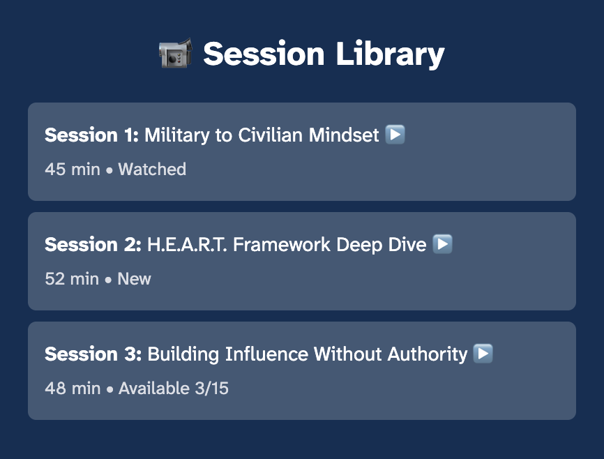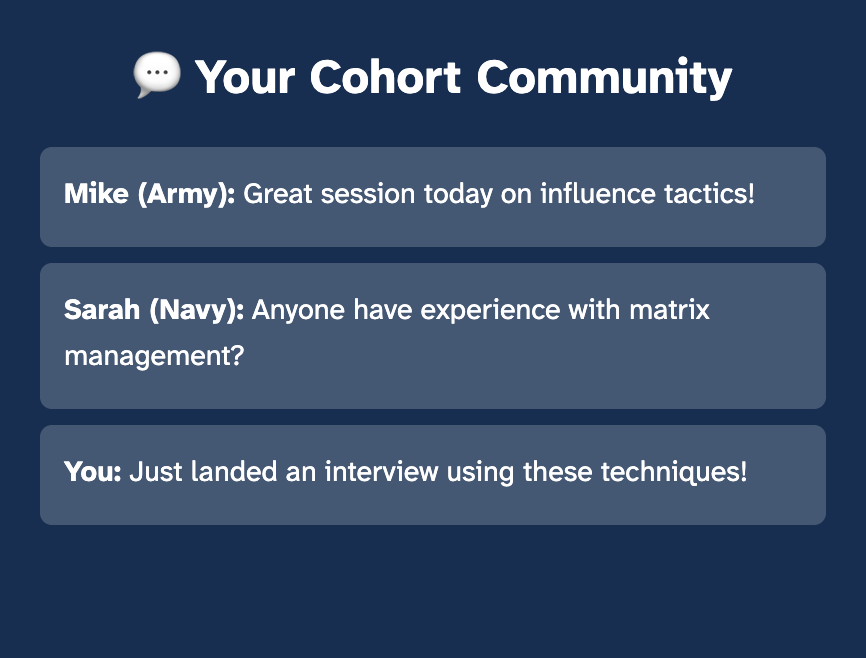 Experience the power of cohort-based learning designed specifically for veterans transitioning to civilian leadership roles. Build lasting professional relationships while mastering essential workplace skills.