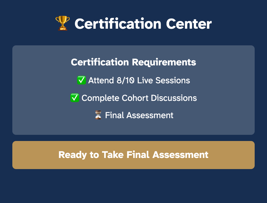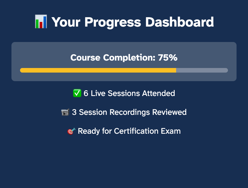 Track your progress through the curriculum, monitor live session attendance, and see your path to certification.