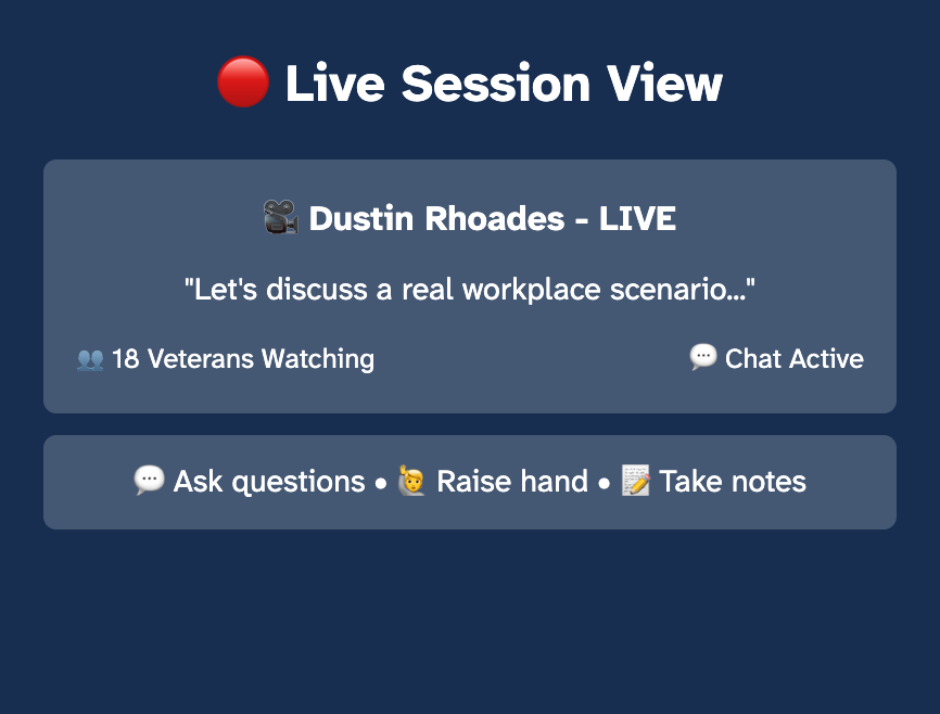 Join live sessions with full video, audio, chat, and interactive features. Participate in real-time discussions with Dustin and your cohort.